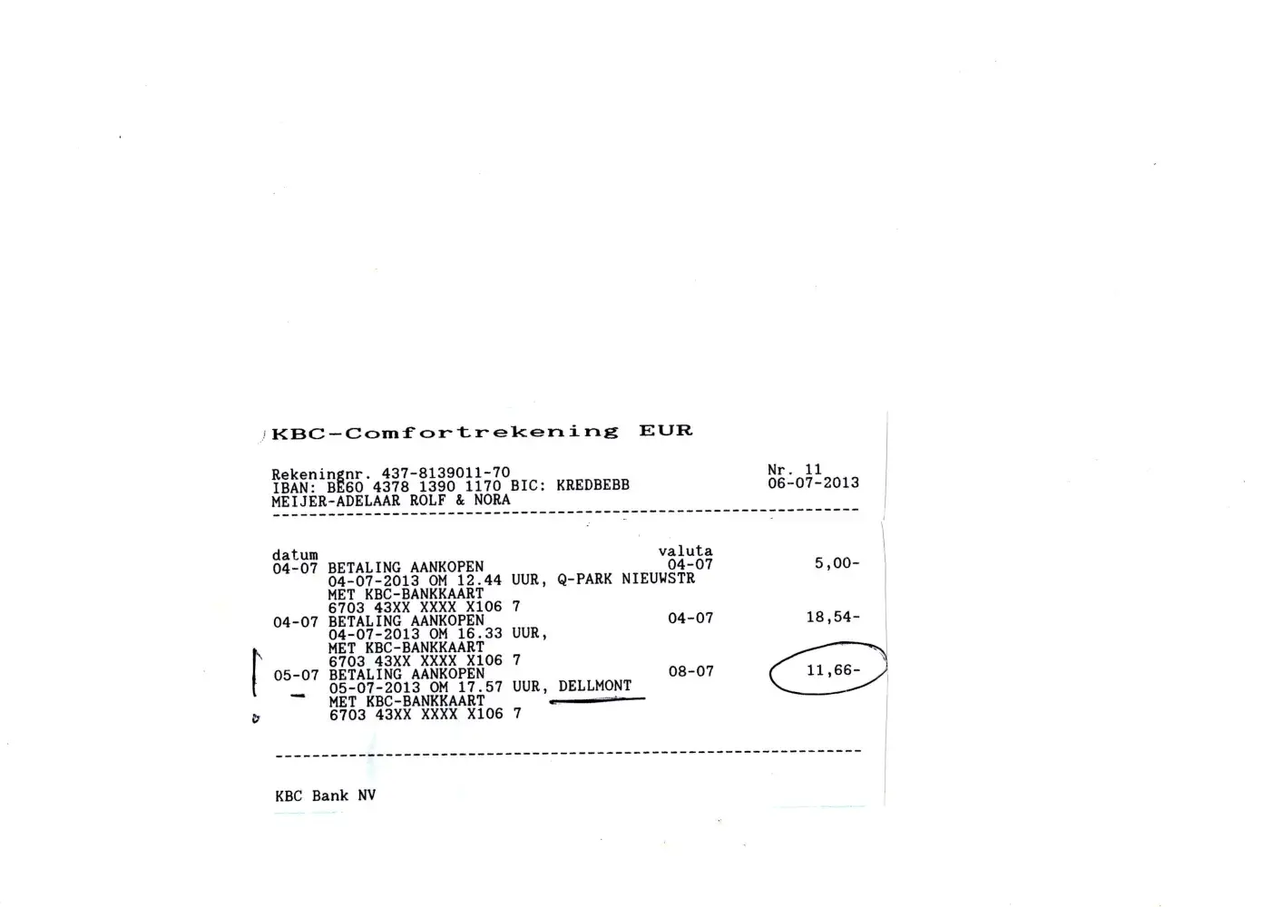 On 5.07.13 at 17.57 an amount of € 11.66 has been paid by KBC Bancontact/MisterCash to Voipbuster.com via Dellmont.