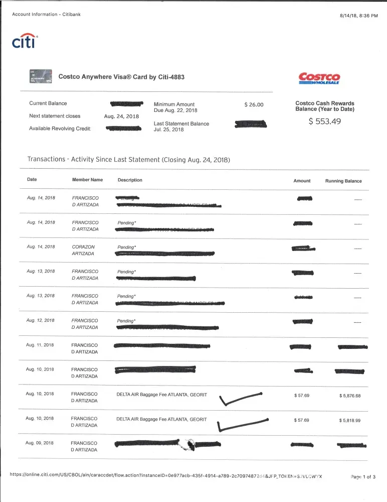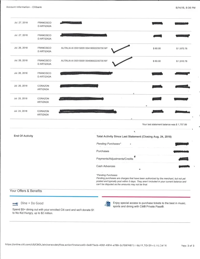 2. Citibank statement reflecting the baggage fee charges on July 26 and August 10