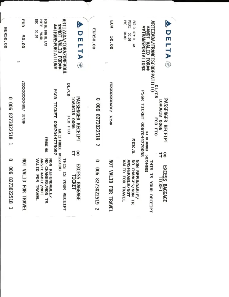 My husband and I with another couple went on a cruise and purchased a ticket on Alitalia airlines going to Rome (FCO). We and the other couple were told to pay a baggage fee @$60.00 per person. My husband and I checked in with 1 baggage each. We were told that this is one time fee and will no longer be charged for baggage fee on our trip back to Los Angeles. Our trip back to Los Angeles was Delta Airlines. We checked in on August 10 and quite a surprise that my husband and I had to pay another baggage fee each. Please see attached citibank statement reflecting the baggage fees charged to our credit on July 26 and August 10. What makes it so bizarre the other couple who traveled with us wasn't charged twice. They didn't have to pay. The baggages both my husband and I checked in weigh 40 lbs each.