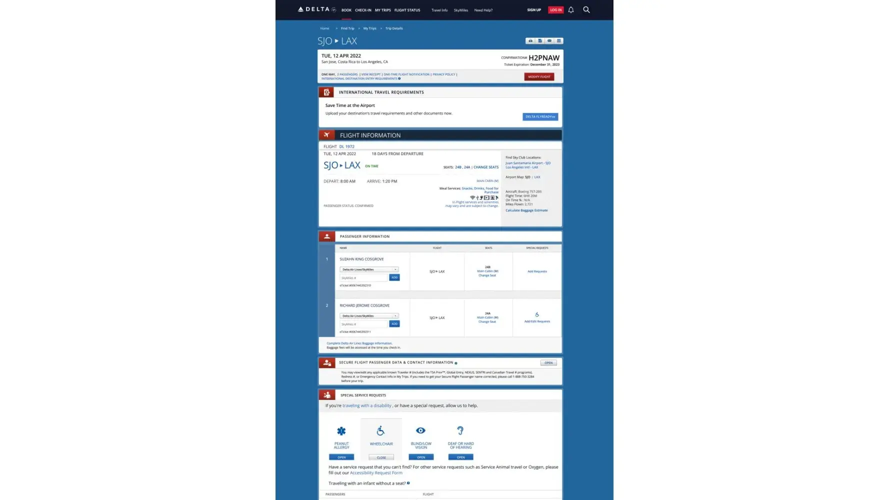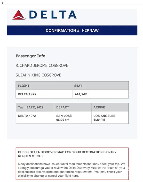 On March 26, 2022, I received a Confirmation from Delta Airlines with the confirmation # of H2PNAW for Delta flight 1972 on April 12th from San Jose, Costa Rica at 8am to LAX arriving at 1:30. See Exhibits A and B