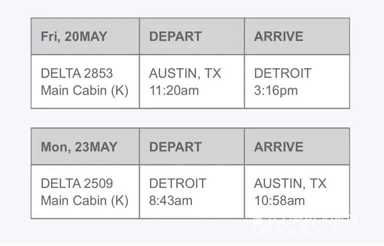 1) I was flying out of Detroit to Jacksonville on Sunday May 15th. I had a meeting Monday Morning at 8am.