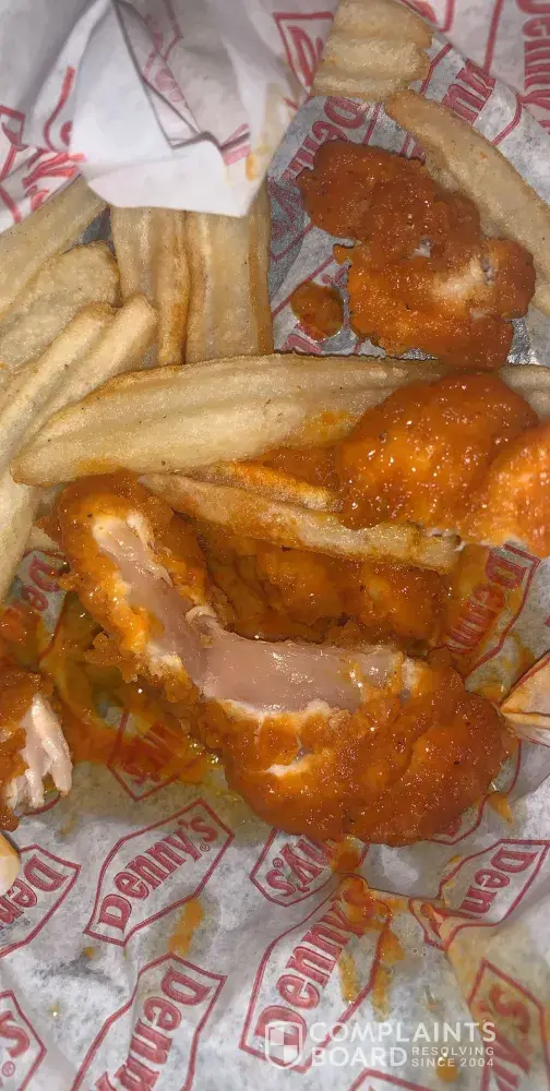 I went into Denny's on June 14th at around 12 midnight. I ordered buffalo chicken boneless bites alongside a side of fries to take out. As I got to my hotel room and started to eat my food, I realised the chicken didn't taste right. When I broke the chicken open, all the pieces were pure raw and looked like they had been cooked for around 10 seconds maximum. I then returned to the store and requested to speak to the manager, whom then was very rude to me. I told him that he had served me raw chicken however there was no apology or any compensation. He then refunded my money and under his breath apologised like he didn't mean it.