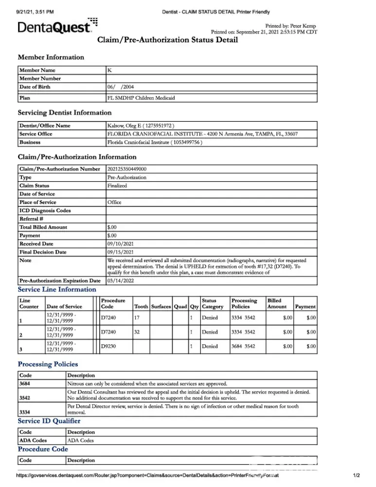 DentaQuest Claim/Pre-Auth attached with minor's personal information redacted for privacy purposes.