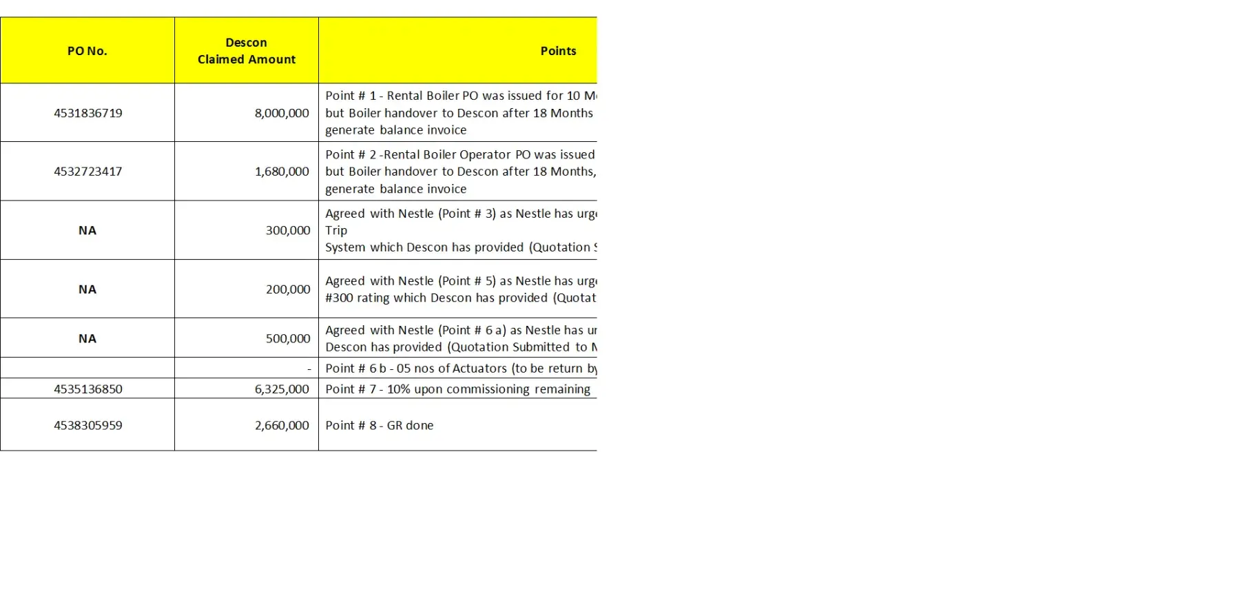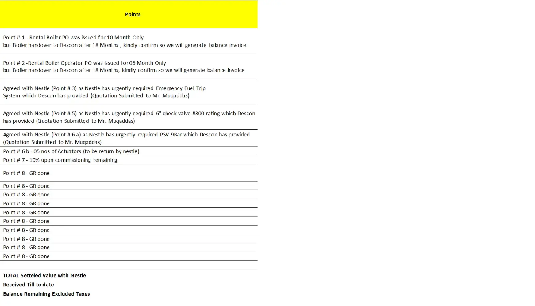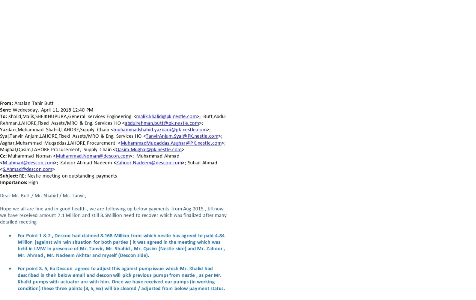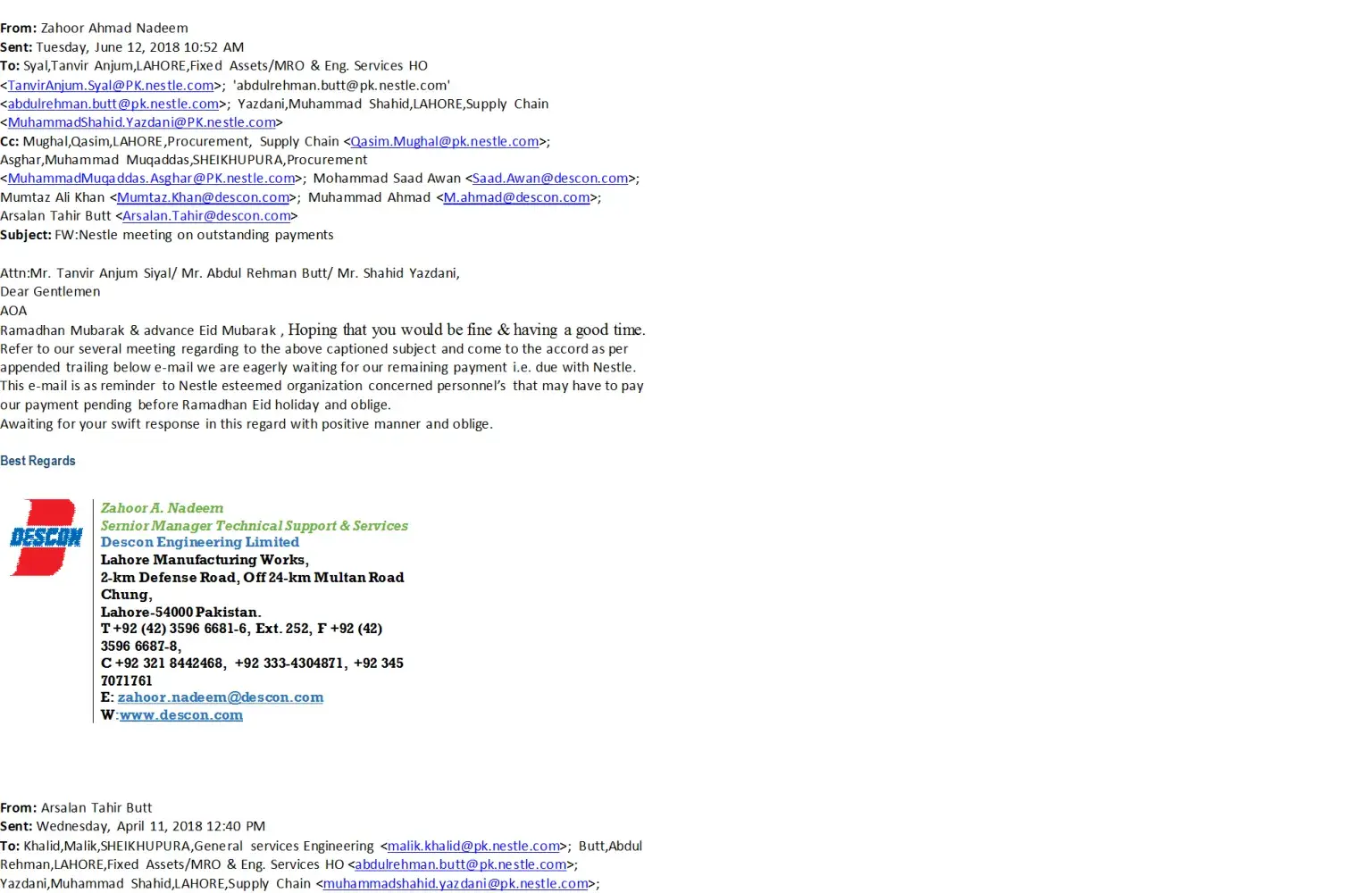 I am manager projects from descon engineering limited. We are serving nestle from long time and still serving. Few of our issues struck with commercail department of nestle and continuosly dealyed after number of agreements. Email attached for your reference. We are in contact with mr. Abdul rahman butt at nestel ho lahore pakistan. I cant attached complete email but pasted parts in paint and attached. You can check from your personal or we can send complete email as per requiement.