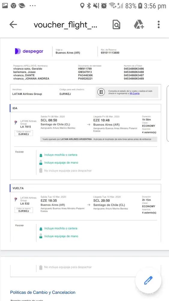 We have purchased tickets to flight out on Monday 6th ( [protected]) until Friday 10th January 2020 for 4 adults ( Santiago Chile to Buenos Aires Argentina) also added 2 extra flights ([protected]) from 7th to 8th of January ( Buenos Aires to San Luis return)