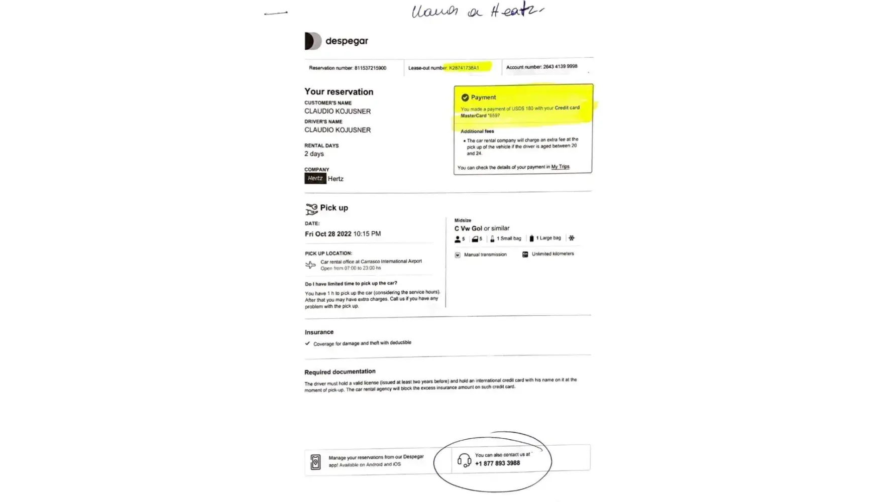 I made a reservation on Despegar’s website and paid $180 for a car rental, from October 28th until October 30th. Despegar gave a reservation number: [protected], a lease-out number: K28741738A1 and a account number: [protected]
