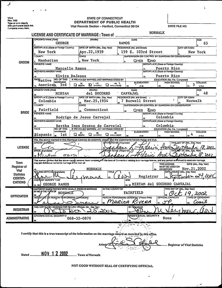 Please pass this on to Mr. Fabio Bustos he asked for ID from my husband.