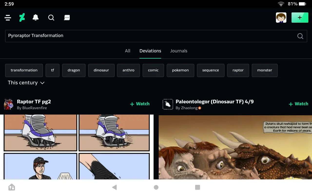 This makes it far more difficult for me to find the art and/or stories I'm trying to look for, and when I typed something like "Alastor", I kept finding irrelevant/off-topic deviations all because of the " This Century" option becoming default (I know the search in the picture I took isn't an Alastor TF search, since I typed "Pyroraptor Transformation" and yet it showed me irrelevant scaly dinosaur transformations, but it just shows how broken the "This Century" option is). Can you please get rid of the "This Century" option? It would be greatly appreciated.