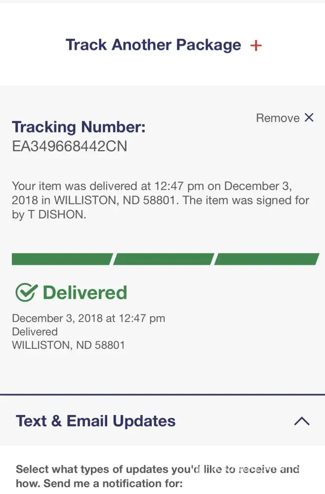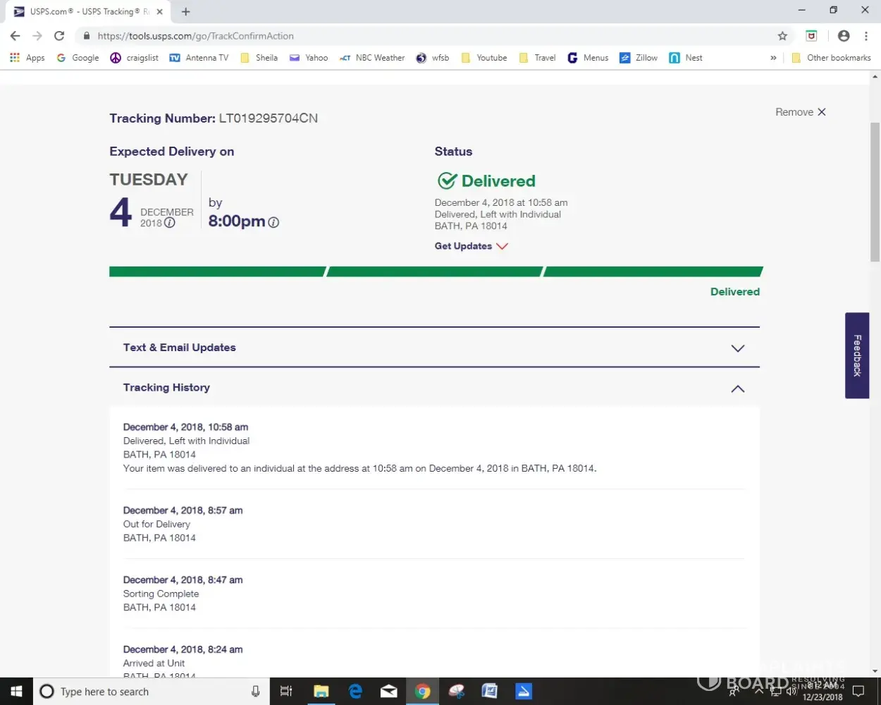 The tracking number, LT019295704CN shows that the package was delivered to Bath Pennsylvania on December 3, 2018.