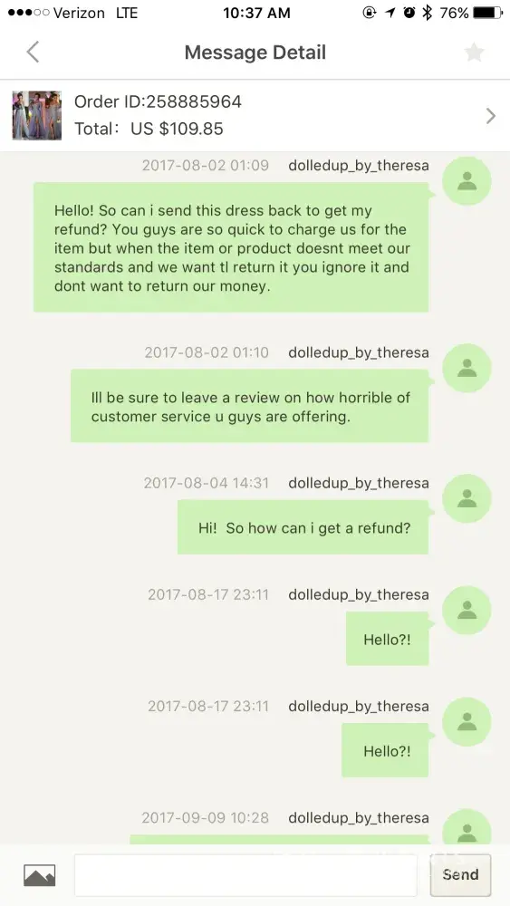 I ordered this dress to see if my bridesmaids will like it since the dress in picture looks really pretty but when I received it, the dress material is cheaply made and the color isn't the right dark red. I've message customer service multiple times they responded once but after I told them I wanted a refund they totally ignored me. I hope filing this complaint will resolve my issue. Attached please find the last messages I sent via chat online. Thanks!
