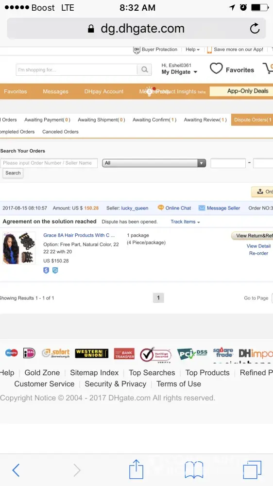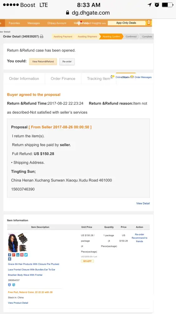 DHGATE said try different internet ISP,