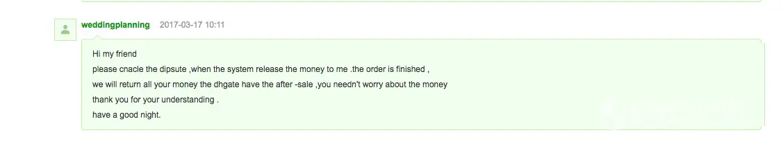 zara_us who promised a refund after I send back the item. The seller stopped responding to my messages and dhgate REFUSES TO help me get my money back. The last conversation from the seller is pasted below and this has been over a year...