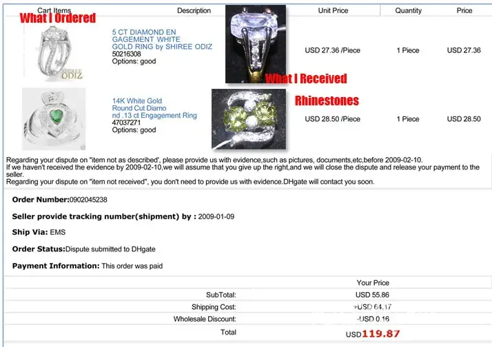 Hello to you i'm James The Jeweler in Atlanta, Ga and i also have my own educational jewelry discussion group here under "JEWELRY & WATCHES" i read your complaint and i'll bet you either went through PAYPAL OR GOOGLE CHECKOUTS to pay for this GARBAGE JEWELRY?