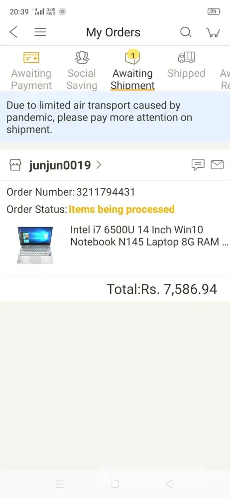 2020-06-10 02:37:55 Amount: Rs.7, 586.95 Seller: junjun0019 Online Chat Message SellerOrder NO:3211794431