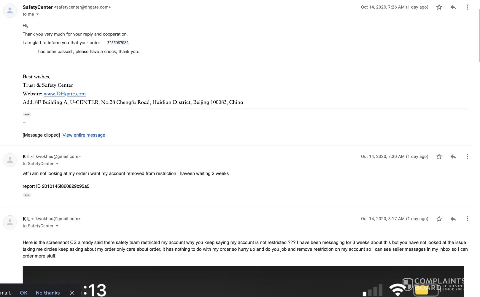 Hi, I have contacted CS agent many times they are useless and don't know what they are doing same with the safety team, my account is under restriction I am unable to receive any messages in my inbox on my DHgate account all stopped since 25th September. I have spent many hours with CS agent trying to find out what's the issue. then I was told to contact safety them to remove restriction on my account because all messages are hidden on my account but CS agent can see the messages on his side but its not showing on my side. I have emailed many times to Safety team but they keep asking what's my order number when I have told them I the restriction removed from my account but they say no restriction on my account.