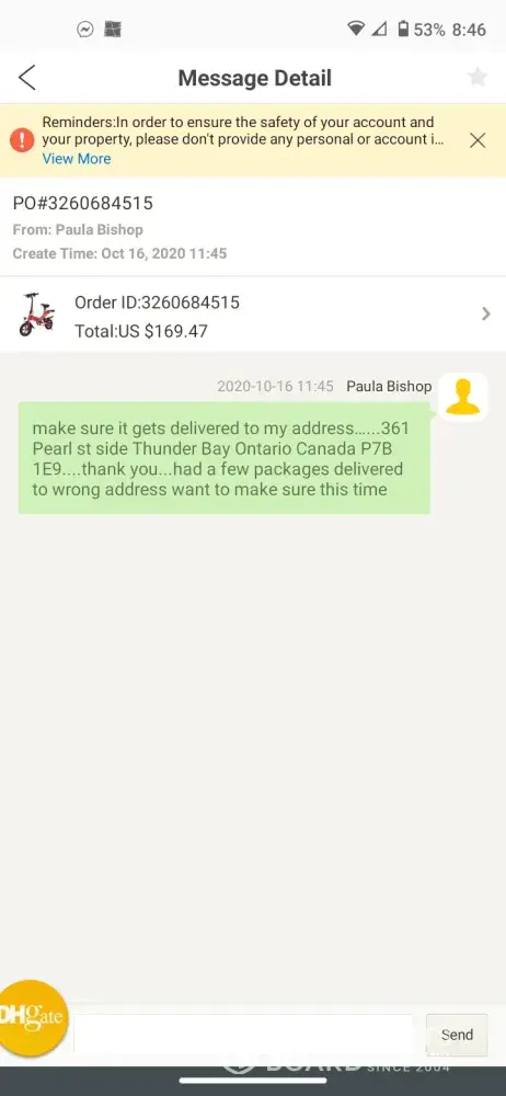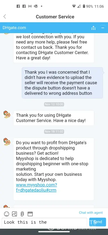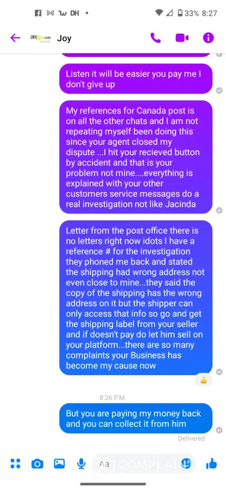 So pissed do not order from them ever and please share so no one you know gets ripped off... I think they might be doing this on purpose I found so many complaints on the same kind of issues as mine... Shame on dhgate we are in a pandemic definitely not a time to rip people off I been dealing with customer service since my delivery man didn't show up contacted canada post they did an investigation reference #138198954... They called me back an the agent said they sent some back to the wrong address to try to receive bit but no answer, the shipping label had wrong address not even my st... I want to contact customer service right away I hit received item by accident so I told the I pushed received but didn't mean too so I opened a dispute and explained all of this over and over and over again all my conversations are screenshots below... I am also tired of hearing to contact the seller how they closed the store as soon as I receive my tracking number...In my eyes your platform your responsibility to protect your customers... Don't ever buy from dhgate you regret it