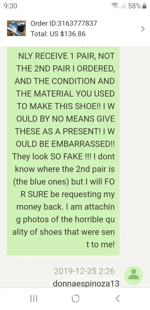 I placed 4 orders on 11/21/2019. The order consisted of 2 pairs of shoes, a hoodie, tshirt and 2 cell phone cases. First off it took over 3 weeks on 2 of the orders to FINALLY depart China. I received the 1st order and the cases were all scuffed up, different color wrist straps, 2nd order: the item was 2 sizes too small &looked like a THICK vinyl iron on design was placed on it. 3rd order: received 22 days after purchase date. They were to be 2 pairs of shoes, I only received 1 pair. They had black smudge on them, where the top was to be leather, it was foam. Point of this is HORRIBLE product quality. (4th order:still in China. Today is 12/26/2019) I have messaged sellers, no responses, I have used the dhgate dispute option. First off after all the time that has passed on waiting on the items to ship, you have to wait 10 BUSINESS days for the mediation resolution. The deadline was 12/17/2019 for their resolution. As of today, once again 12/26, no resolution after their deadline and no response from messages sent. I paid over $300 for all orders(which were all going to be Christmas gifts) So at this point I am out $300, cannot get refunds or messages back from their resolution department.