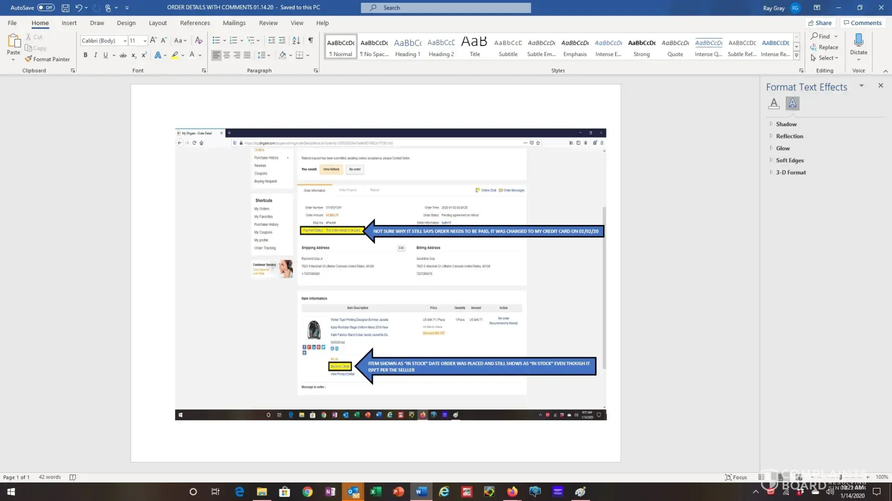 I placed an order for a bomber jacket thru dhgate.com on 01/02/20 for the total amount of $ 46.71. On 01/08/20 I was checking the shipment status of my order and saw a message associated with my order that says "sold out" (see attachment 1 entitled order detail with comments) which clearly shows the item is in stock in china and available. You can still place an order for it however if it is not in stock I don't understand why they would still be taking orders and money for it.