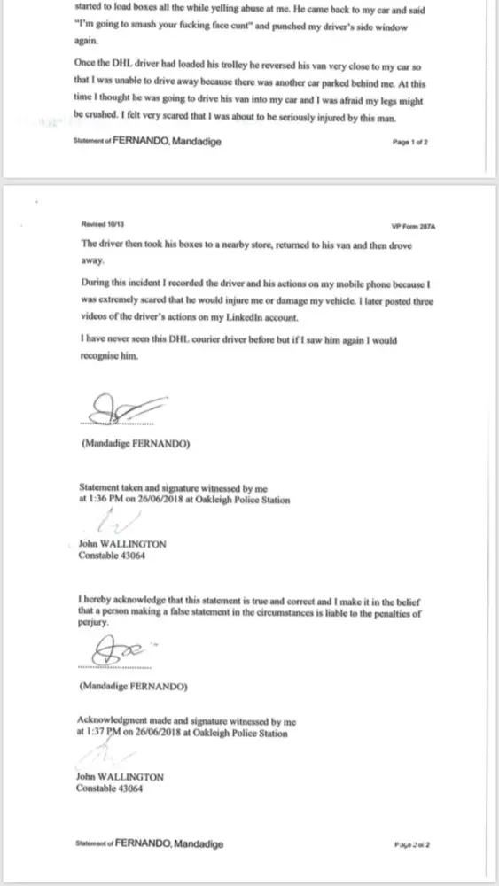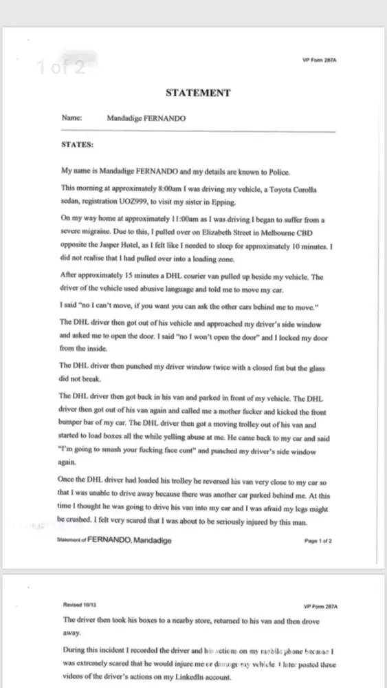 My Name is Sahan Fernando and I'm sending the videos of the road rage incident which happened on 26/06/2018 near Elizabeth street/ Infront of Jasper Hotel Melbourne from your DHL delivery driver. Its is very shameful and he assaulted me in so many ways. I couldn't even sleep the night.