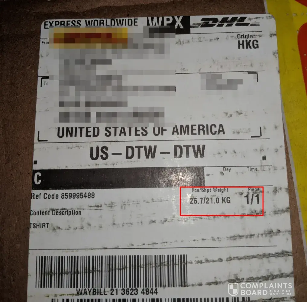 DHL does not have any documentation to show that it was reweighed after being repacked. The shipper will not refund or replace my items until I have that information for their own DHL claim.