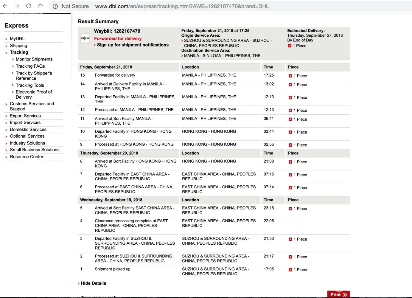 My important documents that was sent by a company in China, used the next day delivery service. The document was picked up on Wednesday afternoon and arrived in Manila on Friday. While I understand that this might not be possible to be delivered on the exact day scheduled, DHL needs to make sure to at least inform their customers by contacting them especially if the scheduled delivery won't be on time. I have to make an effort of contacting DHL and today, Saturday, I have to go to the warehouse which is not easy to arrive to pick up my very important document. This is highly frustrating. I don't even understand that it is already in Manila and the status kept changing from processed to departed again and then arrived.