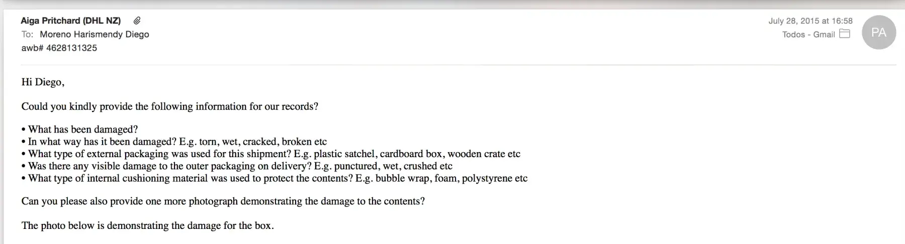 They sent me a parcel from Chile to Auckland. The parcel was a very delicate wind trainer for my bike that was carefully protected. Nevertheless, the "brilliant" DHL services smashed the box like a piece of nothing, the box arrived all broken and smashed. In fact, they opened the box, moved all the items a repacked it leaving everything in a wrong position so during the transport was all broken. Now I have been trying to have a response since de 27 of July and nobody as given me a solution or a response. DHL it's a really crap of service. Who now what else can i do?
