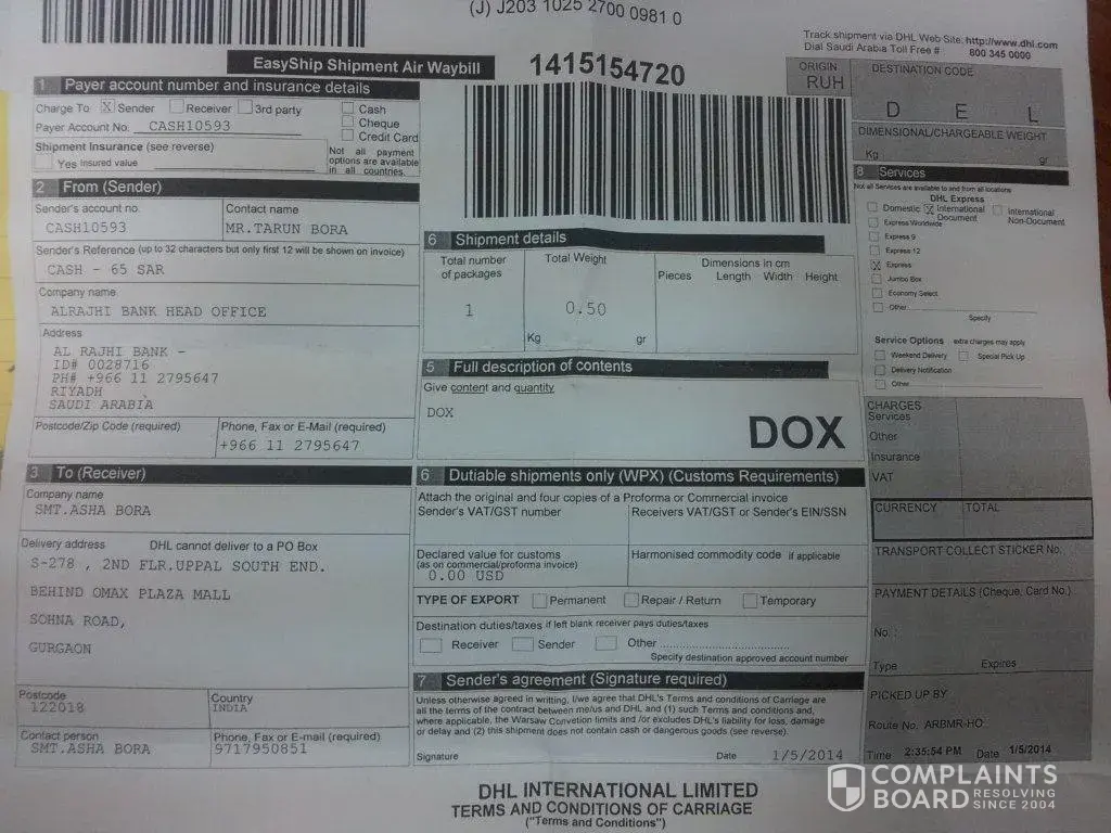 Sent this complaint to the head of DHL customer service and BBB: