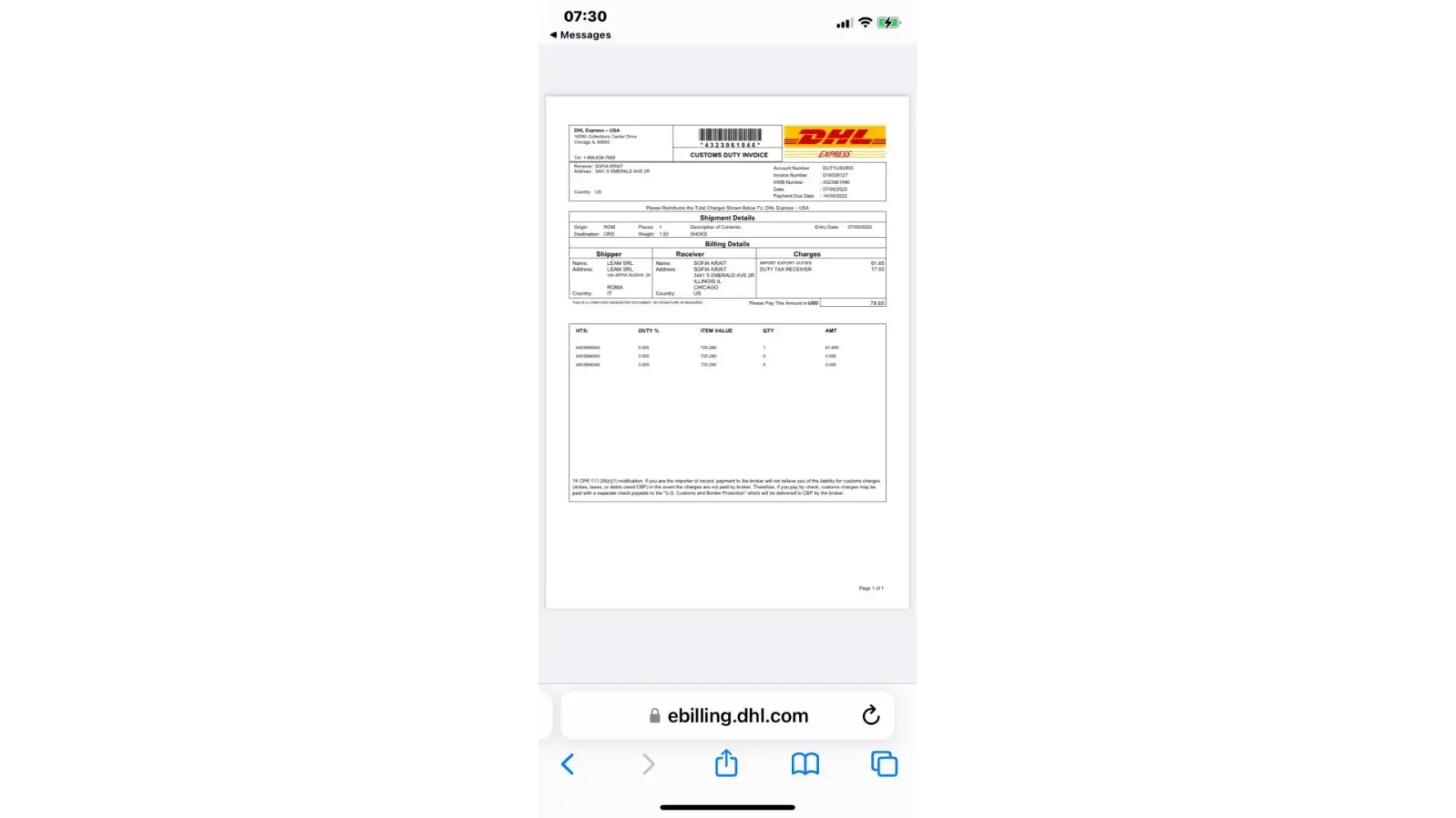 DHL is pressuring me to pay duties on a package that is valued below $800 which by law I am not require to pay duties on. I purchased a shoe from a boutique in italy valued at $725.28. at 7 am i RECEIVED a text asking meto pay $78. knowing that this was a mistake, i immediately contacted their 800# which refused to transfer me to their billing department. I had to google the number called billing, and they are just completely RUDE, UNHELPFUL, and will hand up the phone on people for nothing. When I finally got hold of someone, She stated well you received a different package " which I already paid $155 DUTIES ON because the value was 1300 which is also over priced because this item is taxed at 9% NOT the percentage they charged me". I wanted this 78$ bill to be adjusted off because it is clearly a MISTAKE. they all refused and told me they would send the item back to the sender. I BASICALLY HAVE NO CHOICE BUT TO PAY THIS OUTRAGES ILLEGAL BILL. who are they giving the money to ? because i even called the CUSTOMS office and they assured me I shouldn't have to pay customs duties on items valued below 800$. NOW AGAIN im left with this bill. NOT to mention, they have been overcharging me each time. they are unprofessional, unethical, and should not be operating at all. this company needs an overhall. I contacted many other brokers who also assured me I shouldn't have to pay for this package. howEver DHL BROKERS decide i thinkI think this is how DHL makes money. by inflating bills.