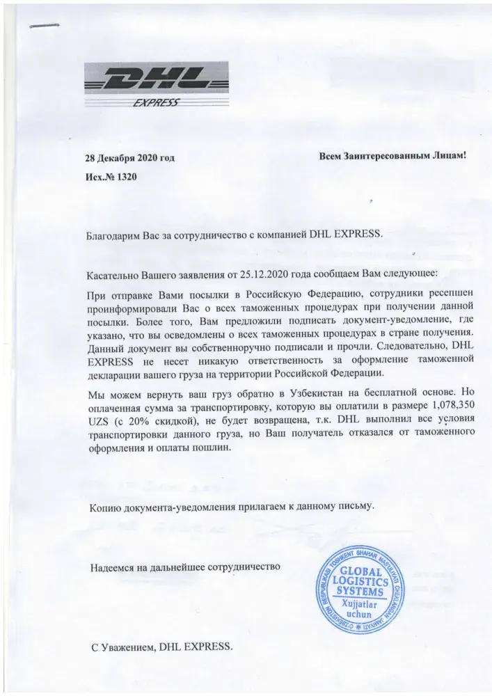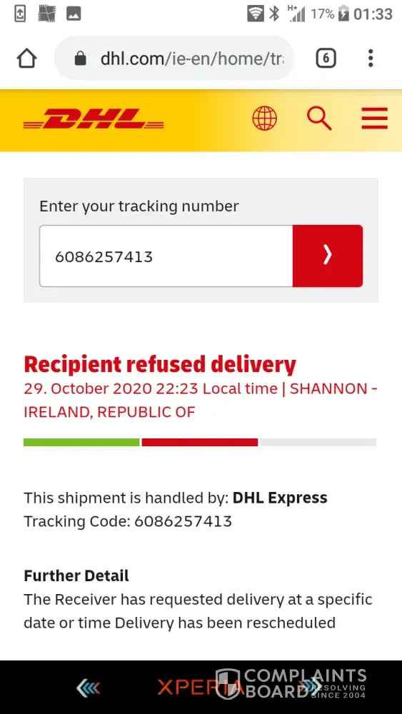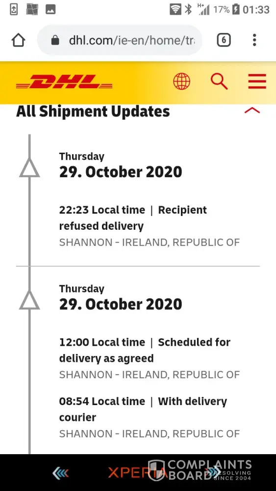 Desired outcome: DHL takes full responsibility of the situation, refunds us and return the parcel to the sender if they cannot deliver it to me