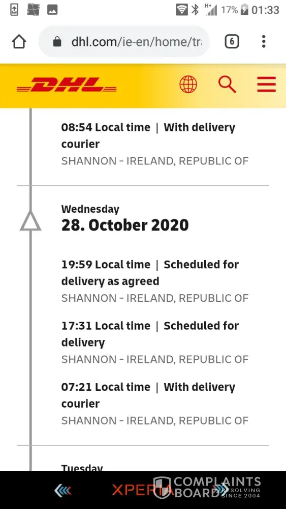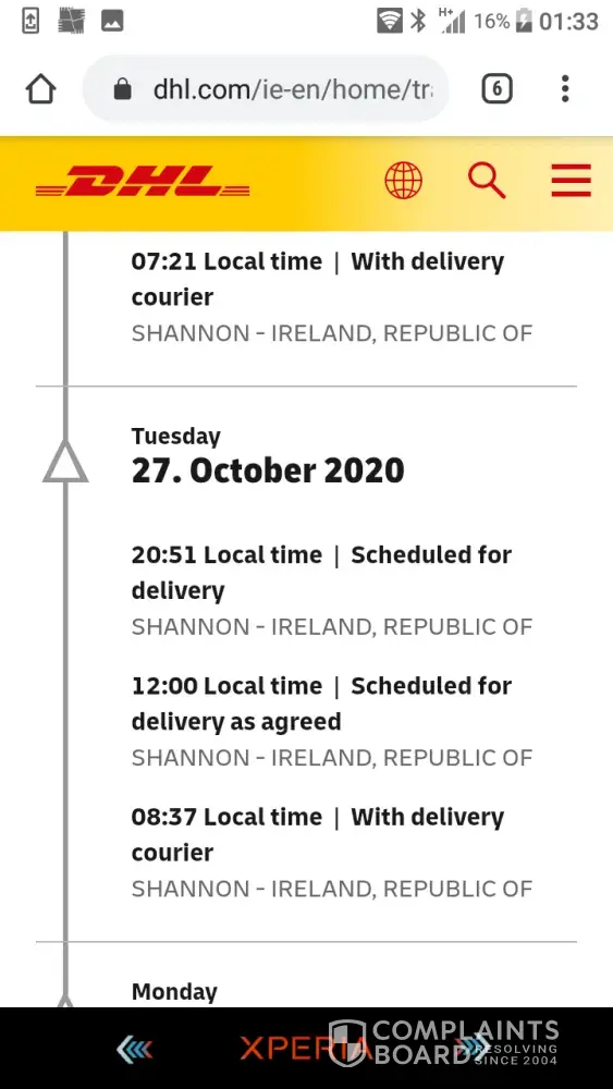 On 16th February I recited a call from delivery person that he is near my door with my order, as I was at work I told him to come tomorrow on 17th of February, I have sent email with my delivery request to DHL and I have recipes the confirmation that I will receive my order on 17th of February.