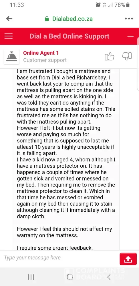 I am frustrated I bought a mattress and base set from dial a bed richardsbay. I went back last year to complain that the mattress is pulling apart on the one side as well as the mattress is kinking in. I was told they can't do anything if the mattress has some soiled stains on. This frustrated me as th8s has nothing to do with the mattress pulling apart...