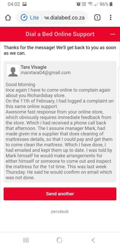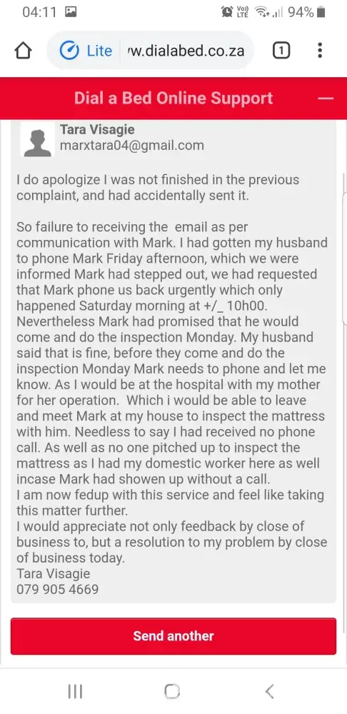 Good Day I am a very irate client currently and I am willing to give dial a bed a chance to resolve the issue before I take this much further. Please read complaints in screen shots provided that I have complained before and was getting feedback, however I assume as the store has obviously tild head office that they have spoken to me. Head office ha...