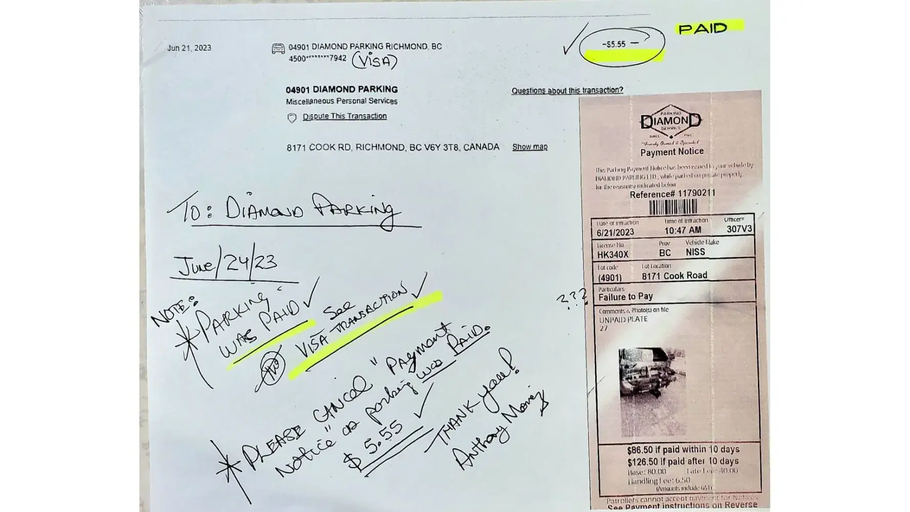 I have copied the vendor by email & Fax ²with proof of CC payment and a request to cancel the fine.
