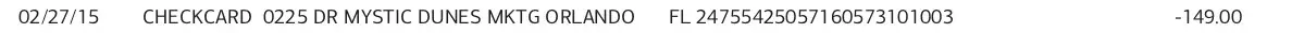2/27/15 - CHECKCARD 0225 DR MYSTIC DUNES MKTG ORLANDO FL 24755425057160573101003 - $149
