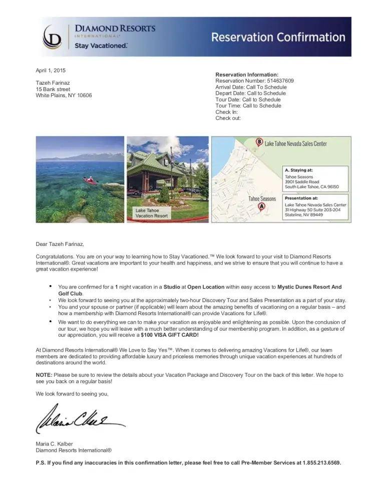 That never happened, despite the fact I went back to Orlando four additional times, each time calling to schedule my free stay and tour with diamond resorts in advance I was told my desired dates were not available.