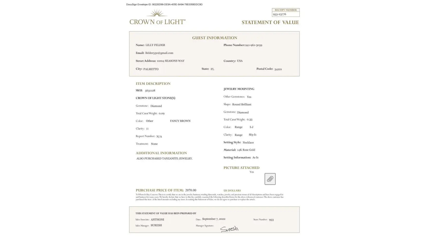 In September of 2022, I purchased Crown of Light earrings and necklace in Grand Cayman. I recently had the items appraised by a Certified Gemologist and discovered the value is significantly lower than the purchase price.