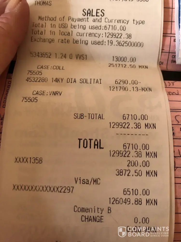 Due to the conflicts in what we were promised verses what was in writing on the appraisals, receipt contract, and the stone being slightly yellow, we felt very uneasy about the entire purchase and decided that we wanted to cancel the transaction. The next day, we tried to cancel our contract and return the purchase within 24 hours at D.I.’s Cozumel store. The manager of the Cozumel store, refused the return of the ring and stated that we must deal with the return directly with D.I. Corporate offices in New York upon returning home.
