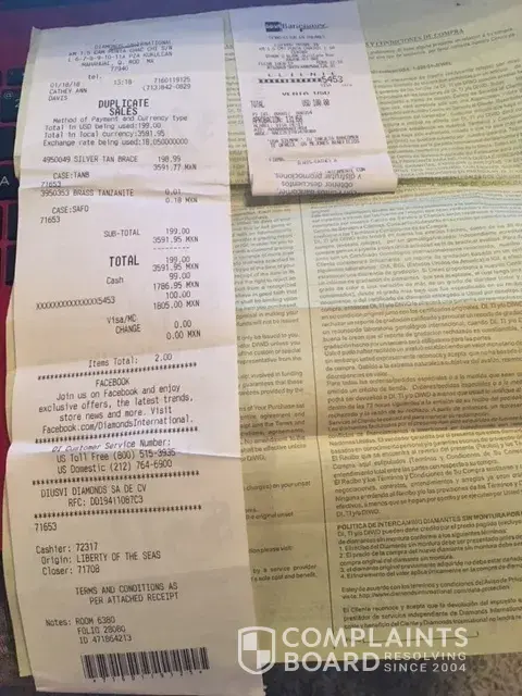 I made a purchase in st. Maarten at diamonds international for a bracelet. I spent a lot of time in the store and found myself rushing to get to my excursion and then after my excursion, spent time before getting back to the ship. Although I signed the invoice, it was signed in a rush to get back to the ship so I did not read it. They threw the paper in my face to say "sign here, sign here" and I signed. On royal caribbean, I attended a presentation. The buyer clearly indicated that the companies represented were backed by royal caribbean, which I believed 100%.