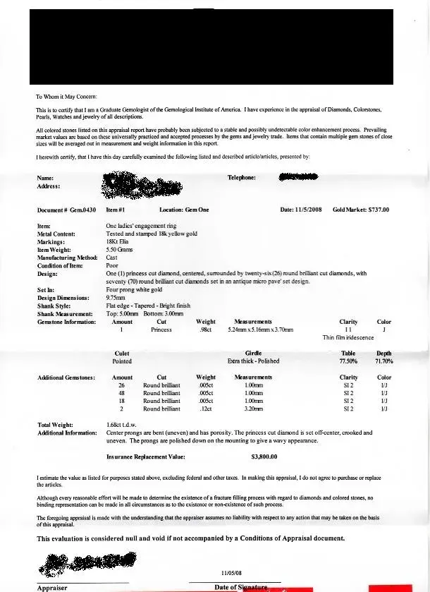 Upon returning to the states, I went to have the ring appraised at a reputable and trusted jeweler. It came as a bit of a shock when the jeweler took one look at the ring, and informed me that I had "been taken" by diamonds international (parent company to ti). The jeweler then proceeded to give me a laundry list of problems with the stone/setting/mounting that include the following highlights: