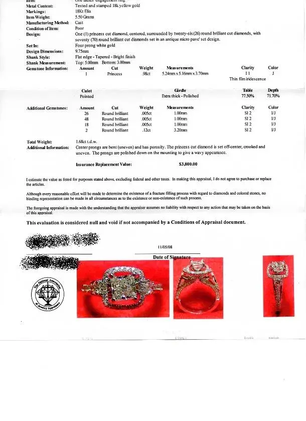 When we got home I looked on the internet and found posts and complaints like this one that made me very worried. I quickly made an appointment to have it appraised and was stunned to find out it appraised at $7500.00. The gemologist estimate the weight at 1.07 ct. She rated it a VS2 but color I.