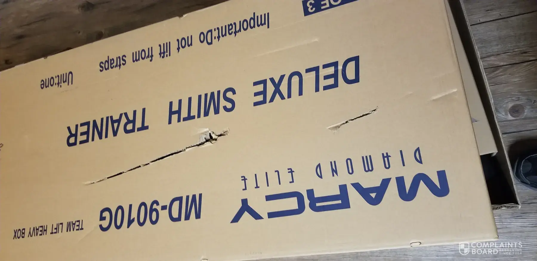 Ordered this product a week ago from DICK's. The product came with the boxes in some rough shape. A whole corner was missing from one of the heavy boxes, and parts were sliding out. Upon opening the product, within the time it took to unpack 3 main base supports the product was shown to be damaged beyond use as one was bent at a several degrees off-angle from where it should have been, with gouges taken out of the finish. Workout posters were slashed (somehow) beyond use for display. It looked like someone took a knife down the center of the shipping box.