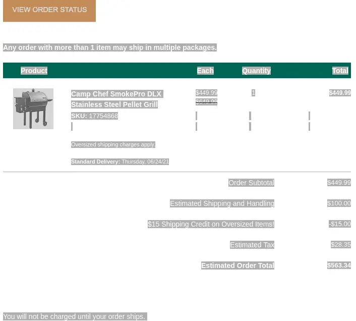 IMMEDIATELY attempted to cancel the order, upon discovering an $85 shipping charge, when Father's Day special stated free shipping. Only after hours of phone calls and online chats with customer service, did they attempt to cancel the order, at which time it was too late. The order had NOT been processed nor shipped, but they stated it could not be canceled. There was a pending charge on my card.