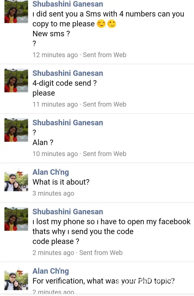 Fake facebook profile of friend asked for handphone number under pretext of wanting to talk.