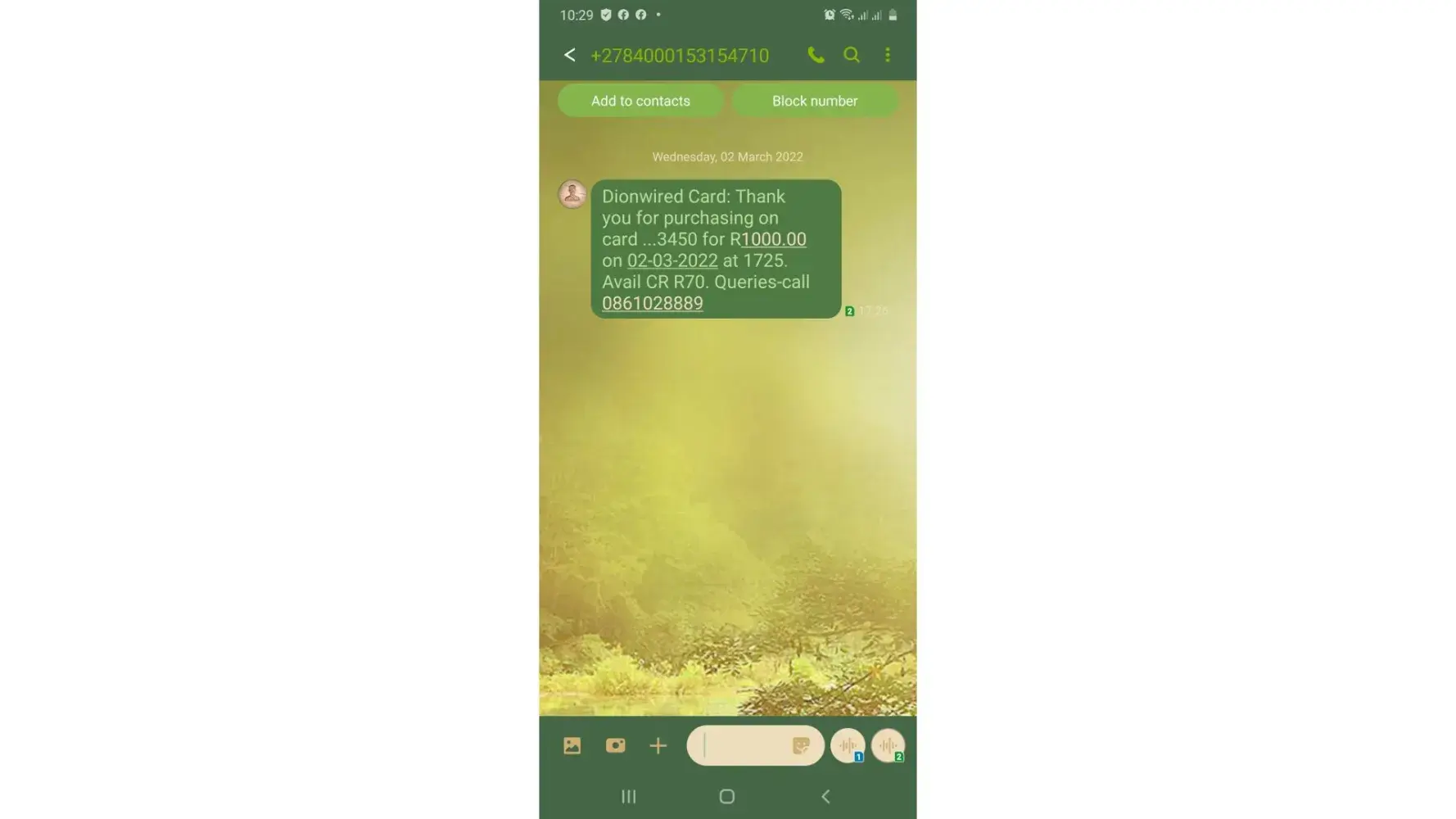 I have received 2 sms notifications for 2 separate sales on my Dion Wired Account Card that I have not made. I was at home during that time with my card with me in my purse. The sms's were sent on 2 March at 17:26 and indicates a sale of R1000 and another of R2000 which leaves me with a balance of R70 on my account.