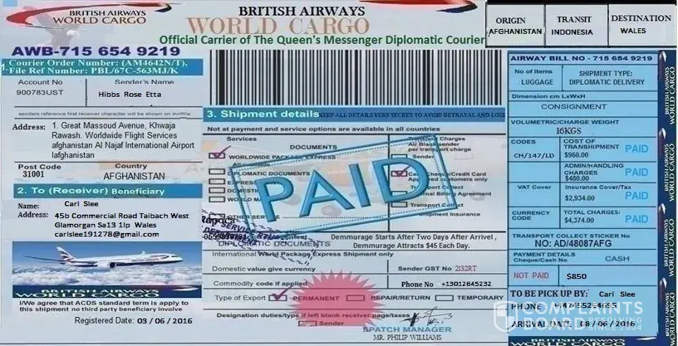 Dear sir or madam I had and email from British cargo diplomat Jakarta Indonesia asking me to pay $850 to pay for a parcel delivery from my girlfriend out Afghanistan but I am not sure if this is a scam could you please let me know asap please my contact number is [protected] my email address is carlslee191278@gmail.com I be gre