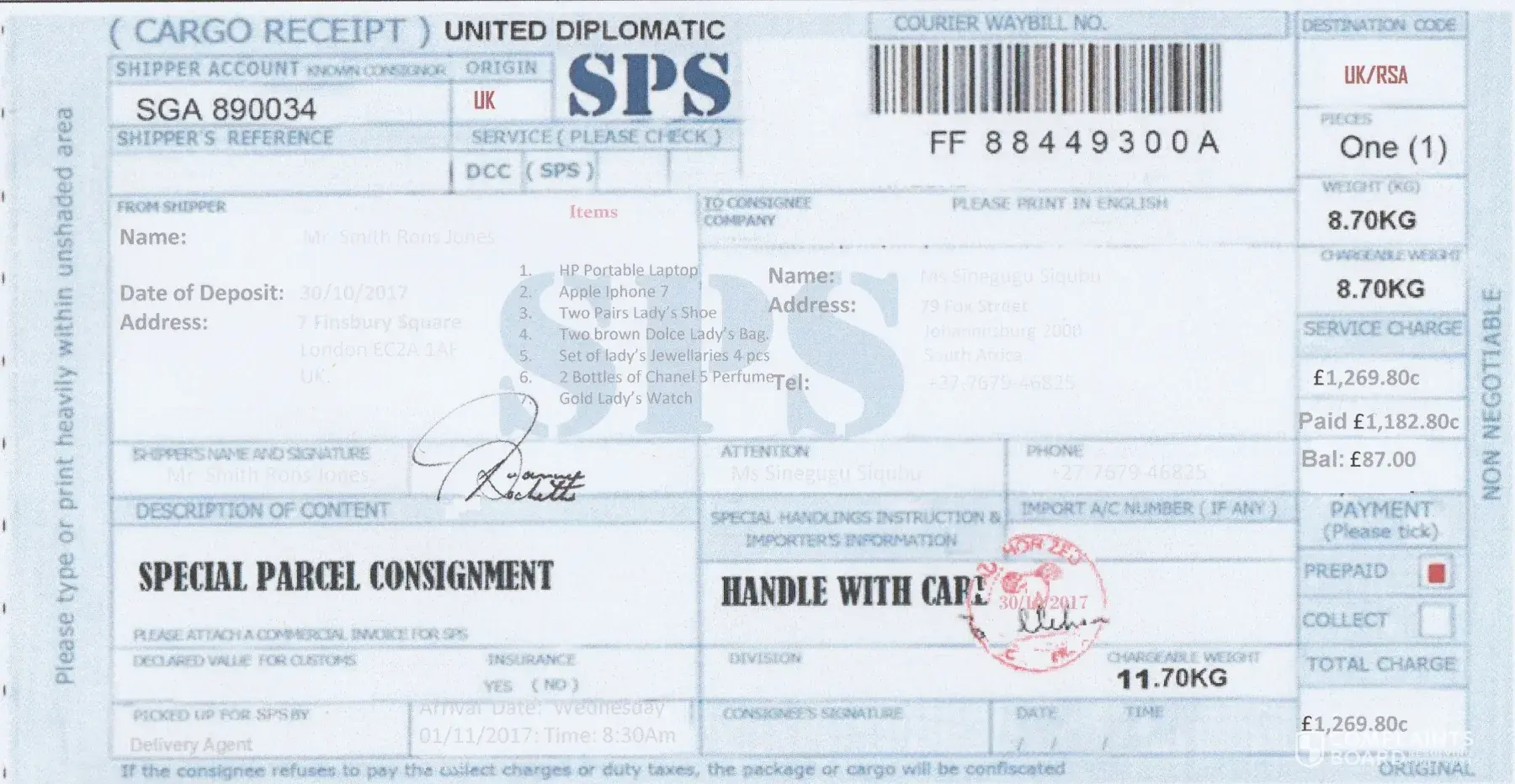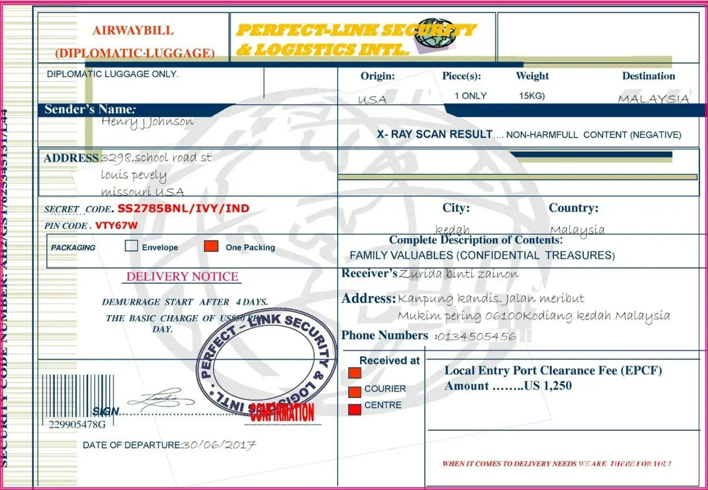 By the 3rd weeks, he said he'd sent a luggage of gifts for me with iPhone 10, iPad, PS4, gold chains & 8500 pounds. I was later told that the cash was for me to pay for the tax clearance in Malaysia which is odd. Cos' my place of residence isn't even in Malaysia. I was contacted by this dubious Malaysia number which informed me to pay $3000 for clearance via bank transfer. Most courier services do not do bank transfers via personal accounts. So this definitely raised alarm.
