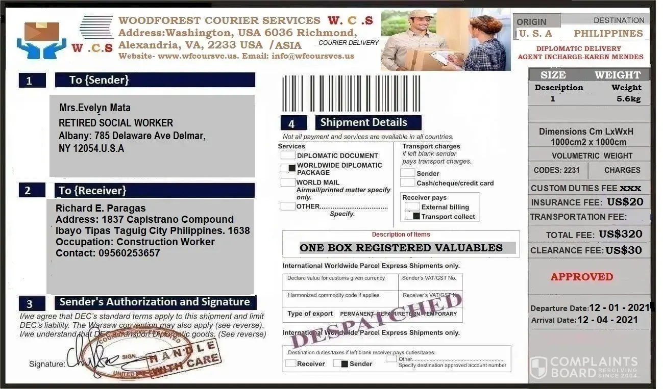 I'm Jane I would like to ask if there is another company just like DIPLOMATIC CARRIER SERVICES AND CONTINENTAL TRUST because I would like to search carefully if it s true and I'm doubted why it is CARRIER NOT COURIER in the receipt and just like other complainants they ask me to pay for the reason that they found a money inside the parcel that's why I need to pay the penalty for releasing the parcel.