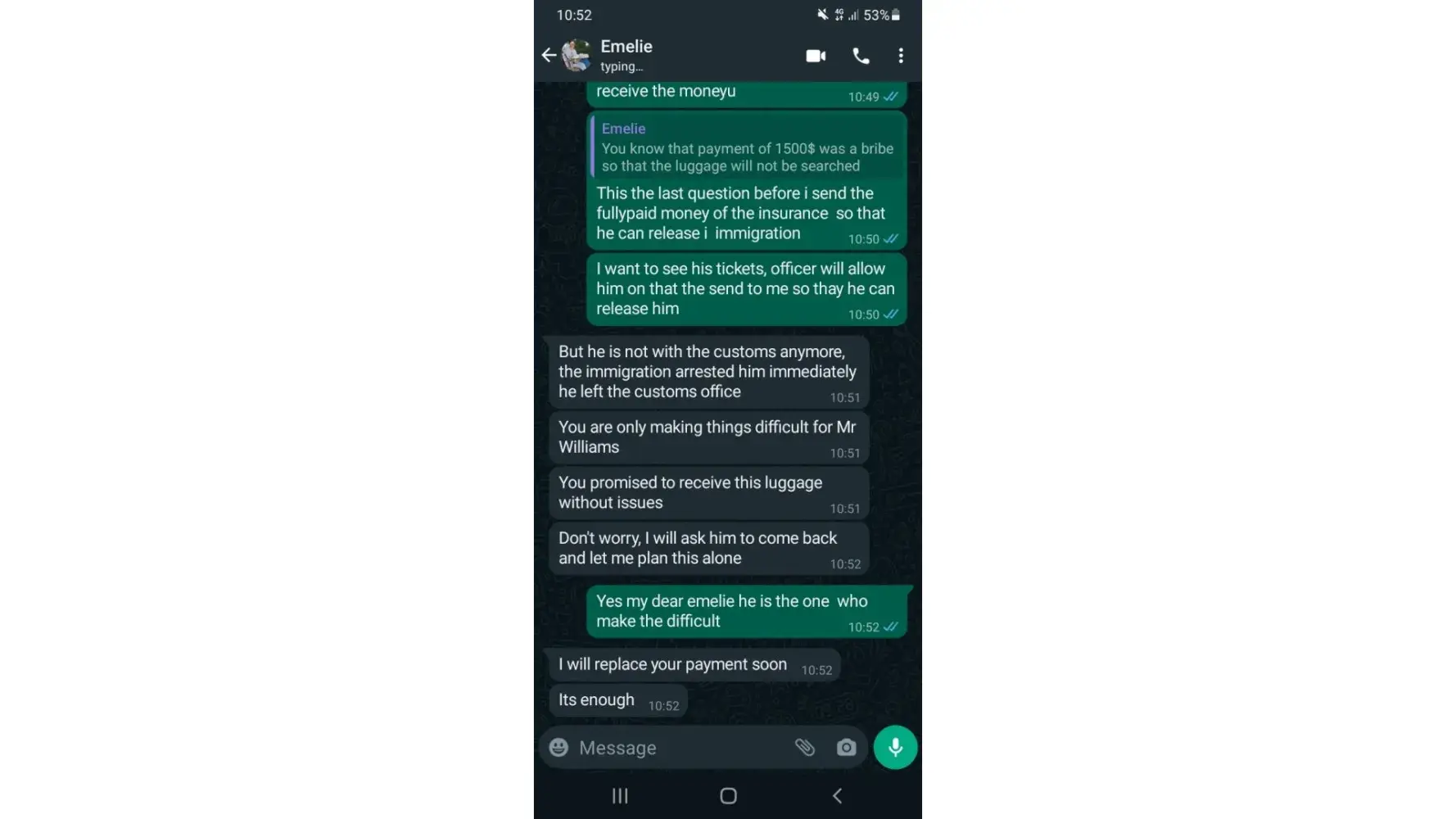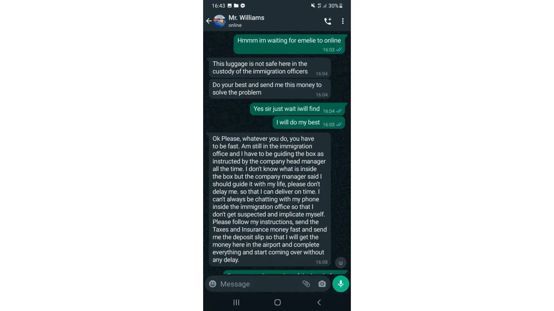 THIS IS THE ONE PERSON WHO SCAM MY MONEY I LOST 1550$ because i need to pay for the taxes to recieve the luggage after he recieve after 6 hours he said i need to pay additional for the insurance that is the reason, thats make me to think. Mr.Williams Peters is the delivery man and the sender is EMELIE ASADEL i have a lot of evidence here.