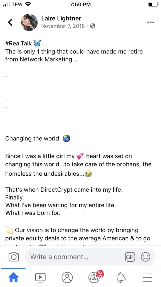 I feel bad and have some regret because I'm the one that told him about this opportunity because I kept seeing Laire posting about it on Facebook and I really trusted her.