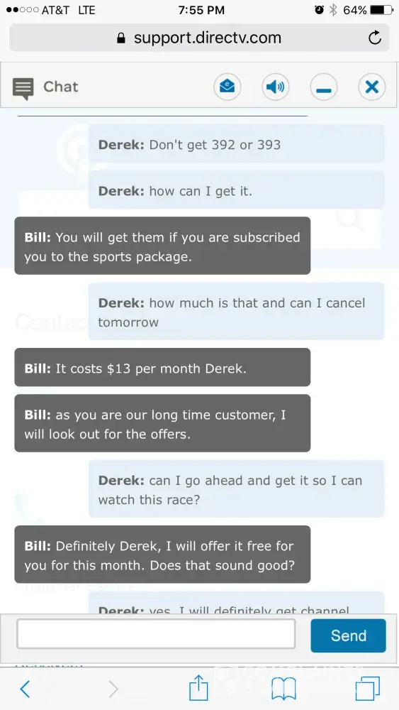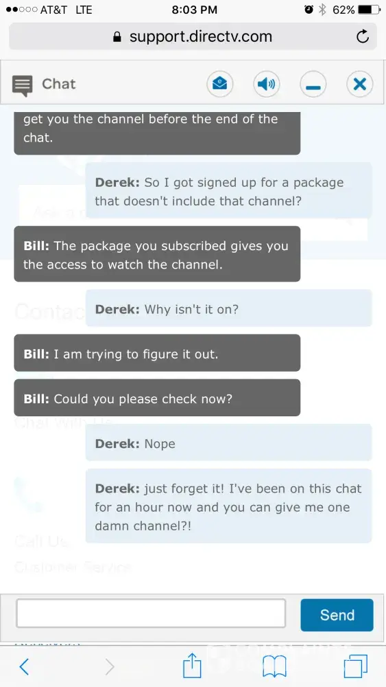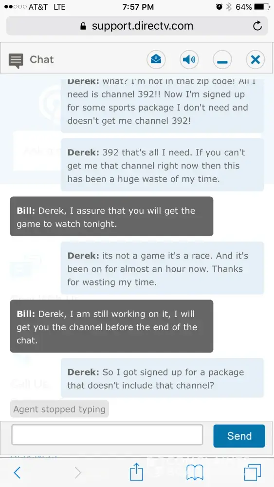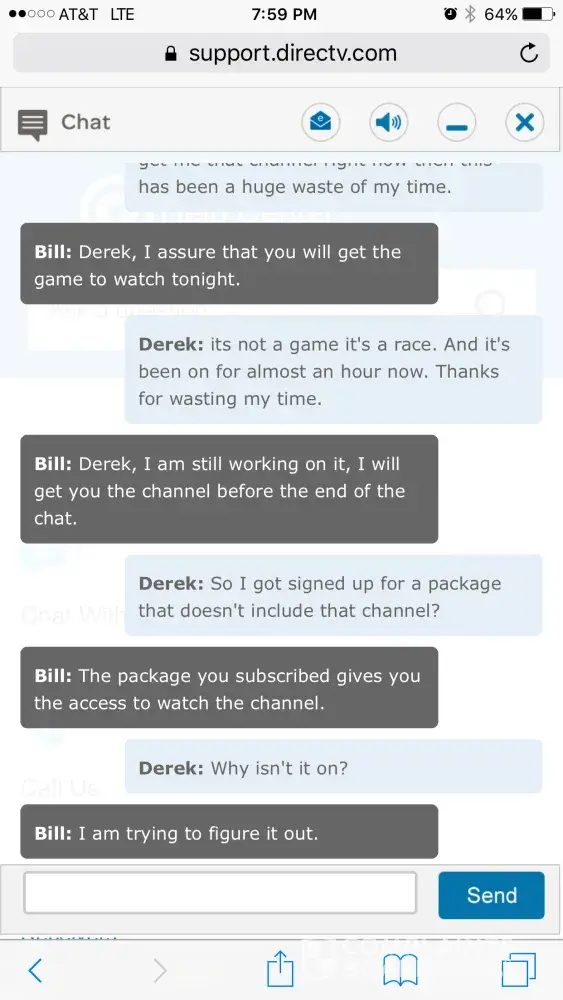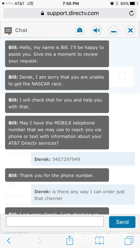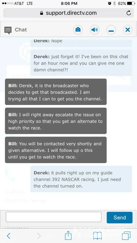 For the first time ever the NASCAR race was on a channel I do not get. Used the chat feature and was on chat for over an hour and they could not help or get me the channel. I then called in and kept getting transferred over and over to different agents who would ask the same questions and never help me out. I was eventually transferred to billing for some reason and finally got fed up and hung up after at this time a 2.5 hour saga. All I wanted was one channel!